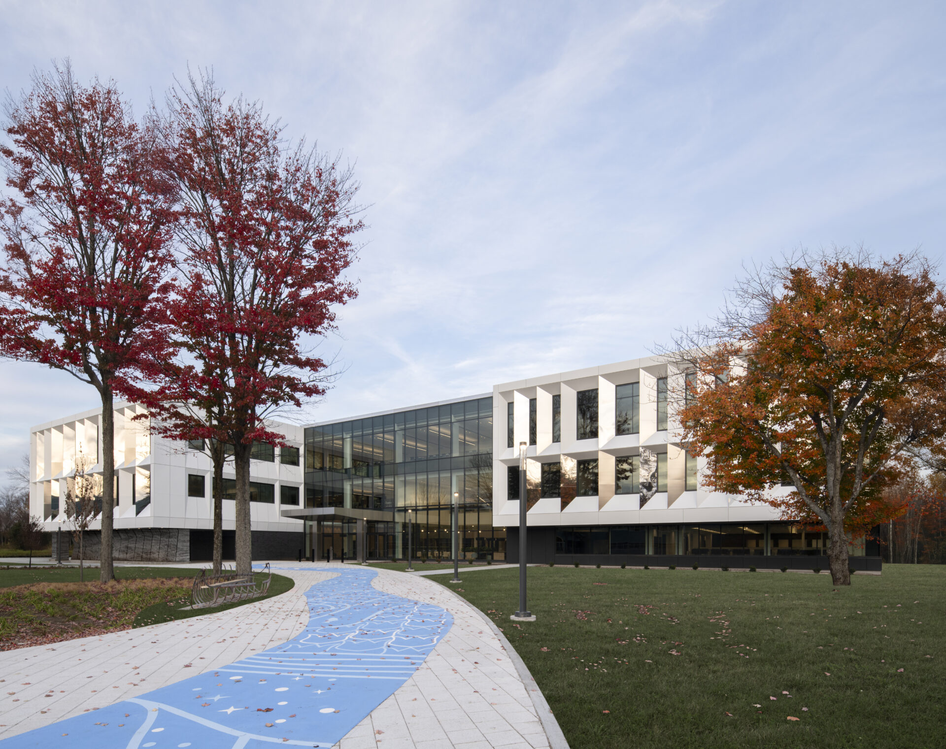 Designed with sustainability in mind, the three-storey building with a total area of 10,578 square metres is aiming for LEED Gold certification and features carbon-neutral building technologies.